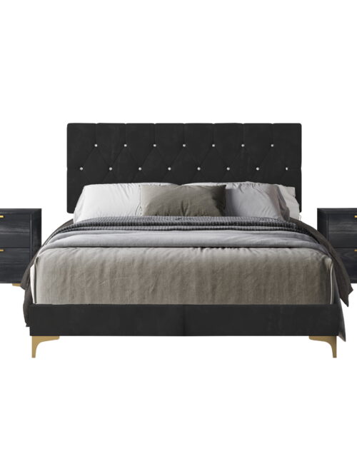 Castle Place Luxurious Crystal Velvet Upholstered Queen Bed With 2 Nightstands, Black