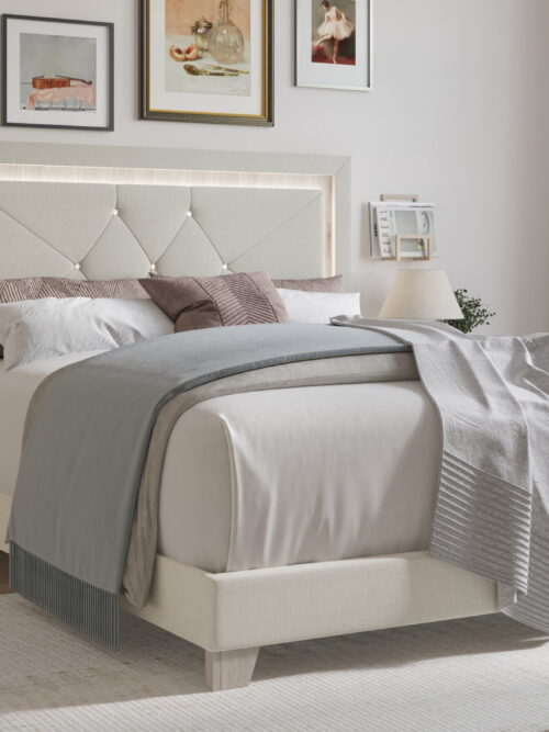• Home Design Perina King Upholstered Panel Bed Frame with LED Light, Warm Gray, Adult Bedroom Furniture