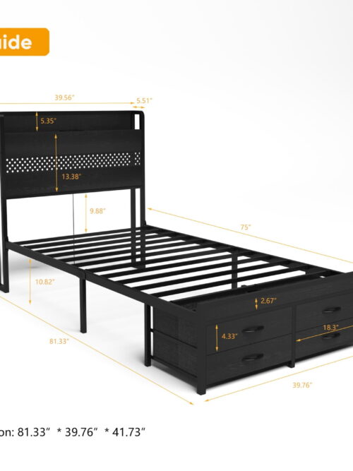 • AENKYO Twin Size Bed Frame with 4 Storage Drawers, LED Lights, Charging Station Headboard, Black