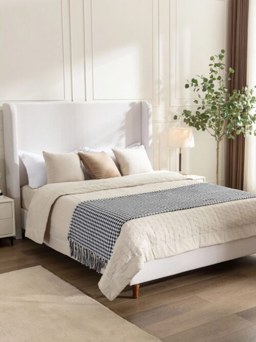 Noble House Hayden Queen Upholstered Bed Frame, 54″ Tall Chenille Headboard with Curved Wingback, Ivory