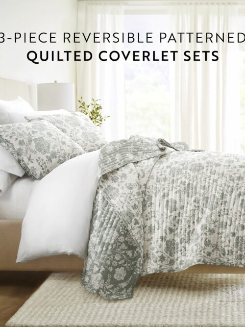 • Noble Linens 3-Piece Eucalyptus Textured Floral Reversible Quilt Set, King