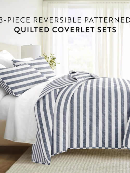 Noble Linens 3-Piece Dusk Blue Classic Stripe Reversible Quilt Set, Queen